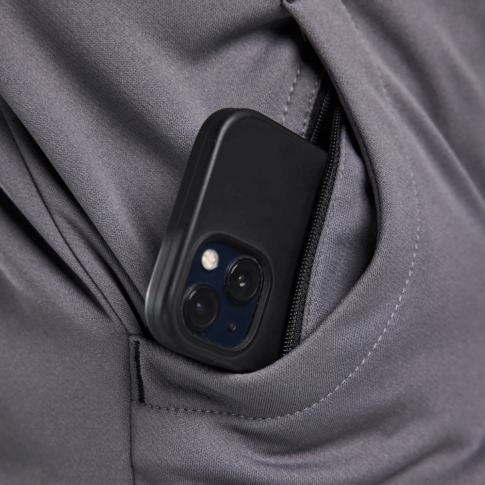 Functional hoodie with soft, brushed lining and zipper. Two side pockets plus an inside phone pocket with zipper.