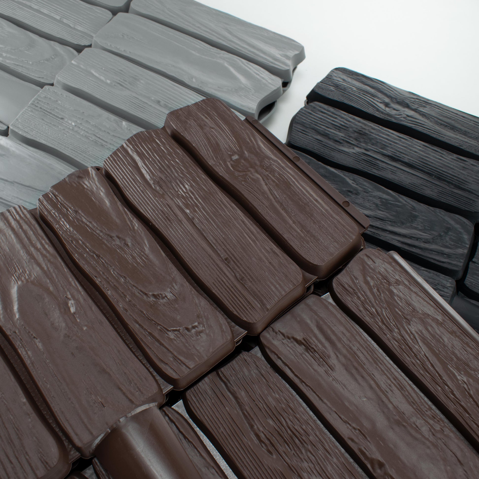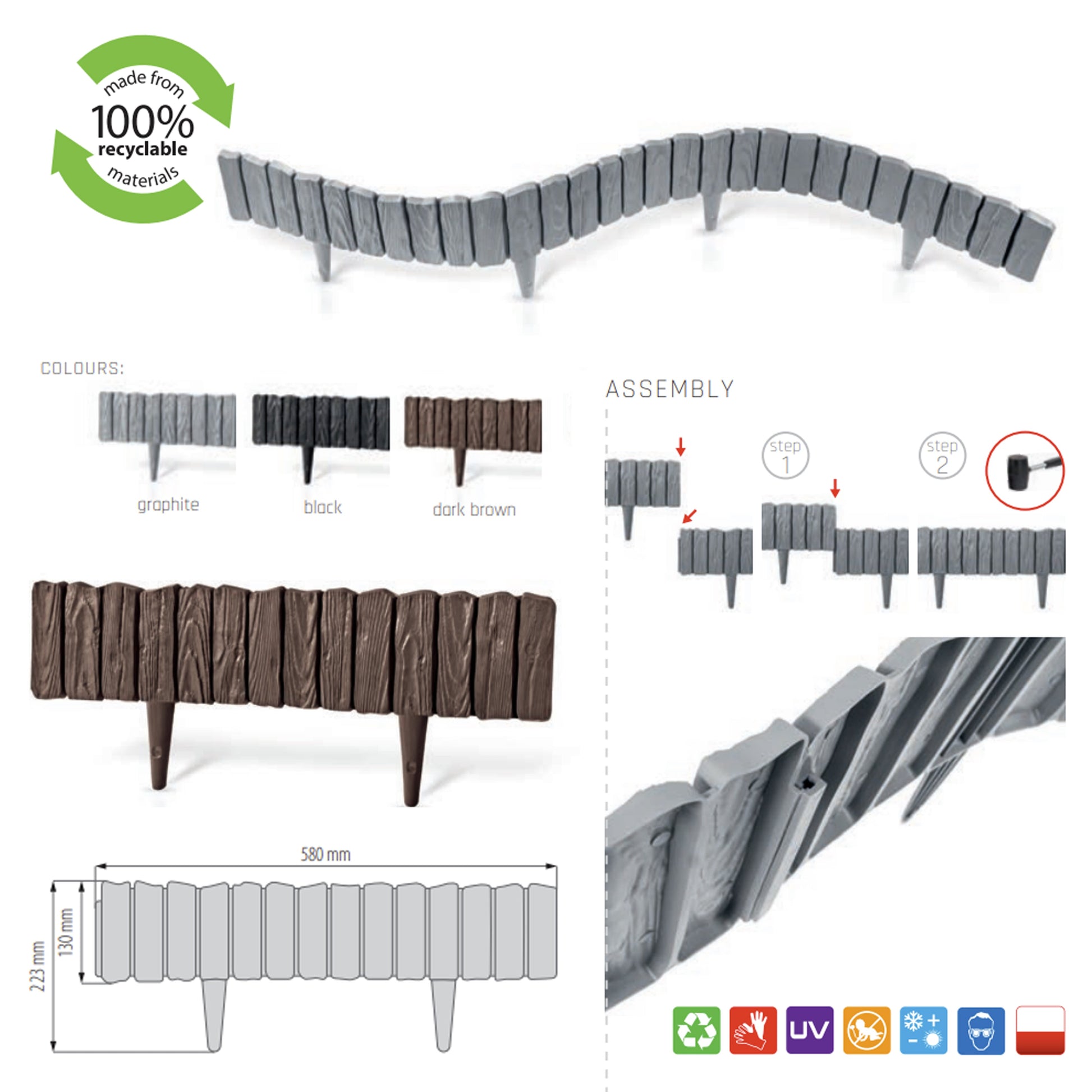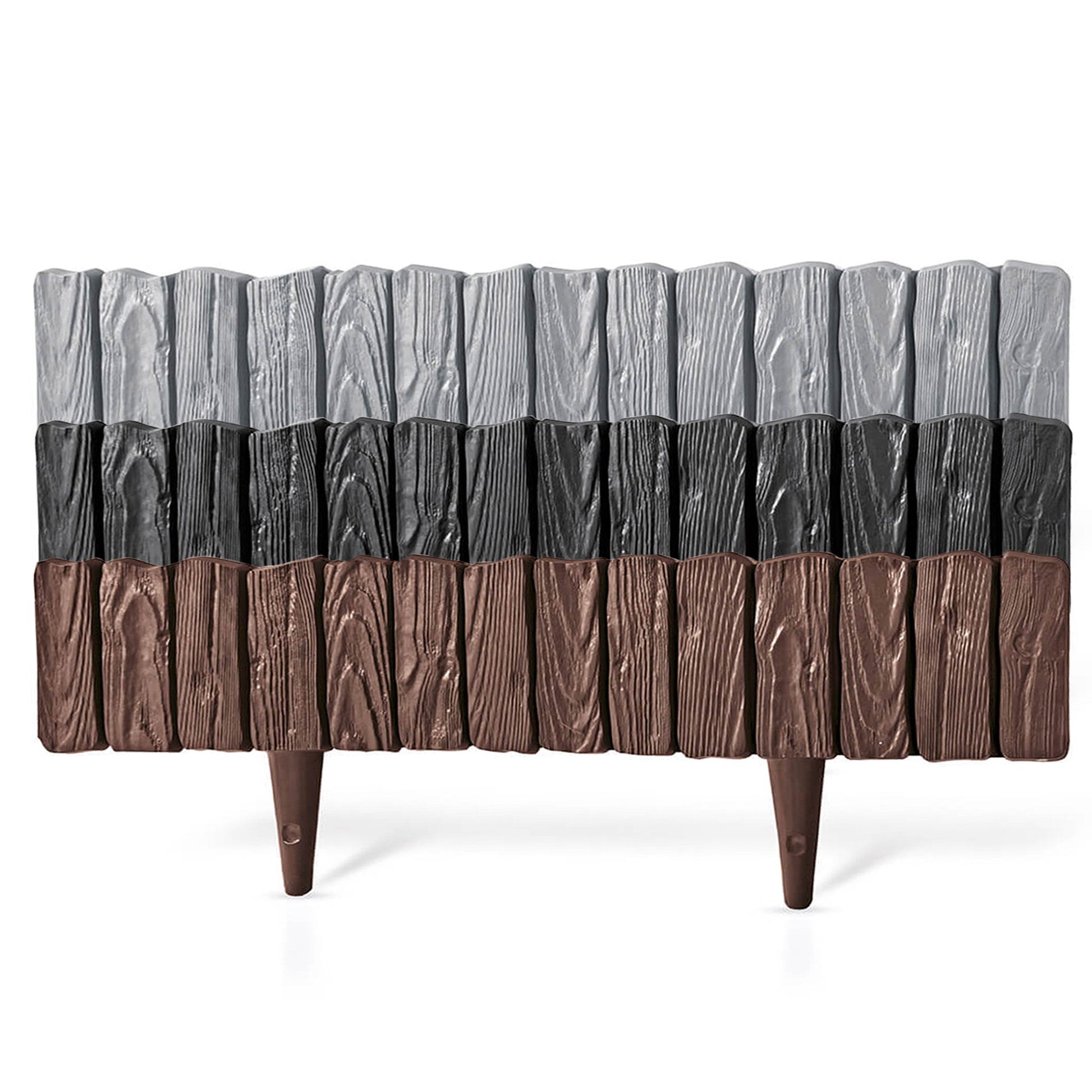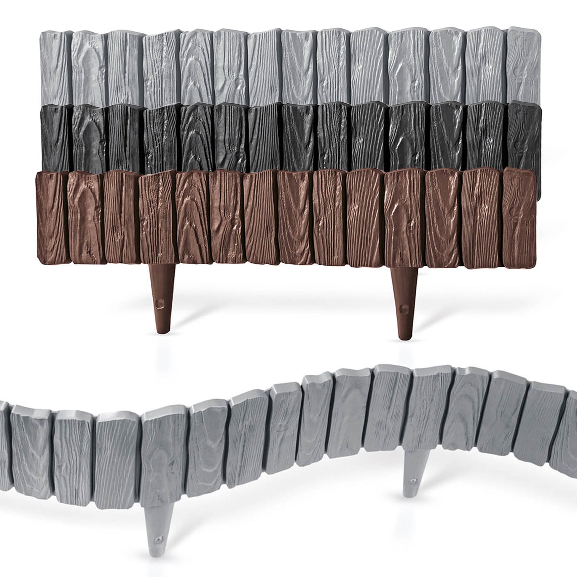 Enhance the aesthetic appeal and functionality of your garden with the wood style palisade edging, a lawn edging crafted from flexible plastic designed to withstand all weather conditions. With its innovative design, the wood style lawn edging offers unparalleled versatility, allowing you to effortlessly create defined borders, straight lines, arches, or circles to suit your landscaping needs.