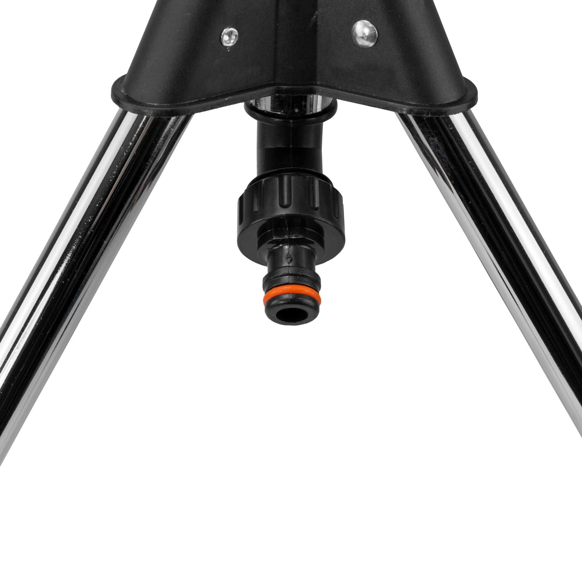 Constructed from durable metal and high-quality plastic, it promises longevity and robust performance. For stability, the tripod features lawn spikes, which anchor the sprinkler securely in place, even on uneven terrain. The sprinkler also offers quick connection to your water supply, simplifying setup and use.