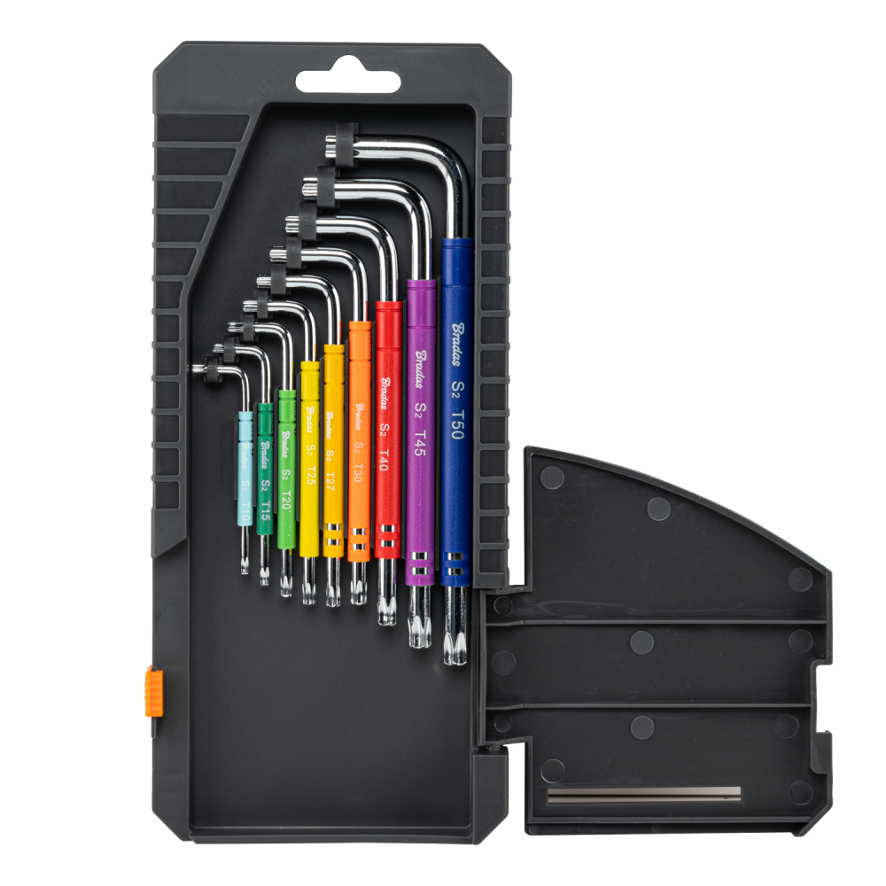 The set includes the following TORX key sizes and colours: TX10 in light blue, TX15 in dark green, TX20 in light green, TX25 in yellow, TX27 in dark yellow, TX30 in orange, TX40 in red, TX45 in purple, and TX50 in dark blue. With a full range of sizes, this versatile set is a reliable addition to any toolkit.